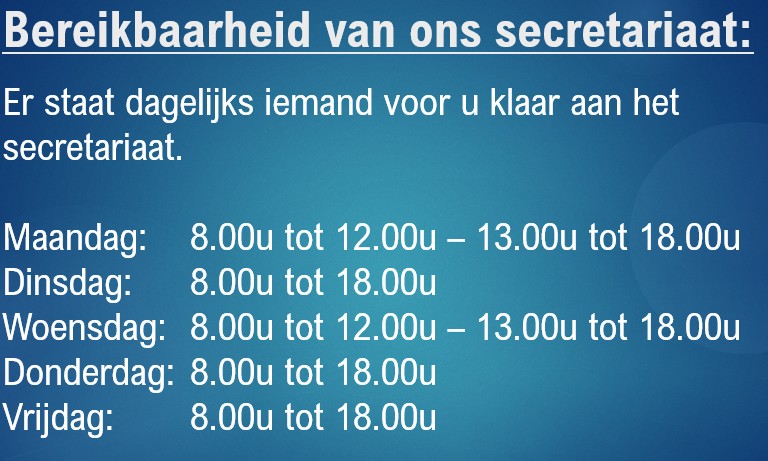 Tussen 8u en 18u is steeds iemand aanwezig, behalve op maandag en woensdag tussen 12u en 13u.